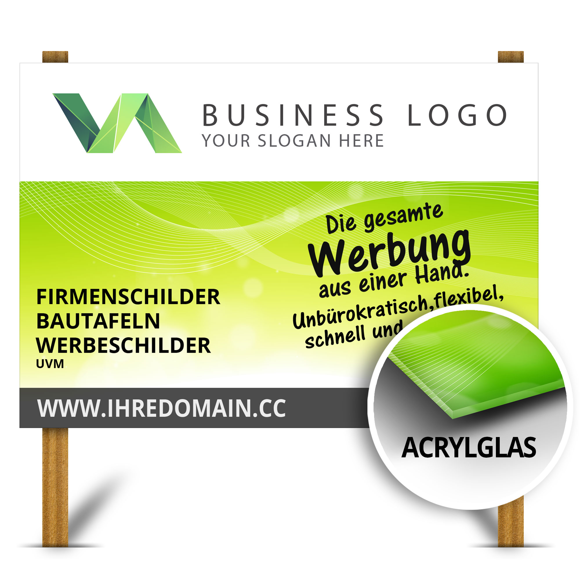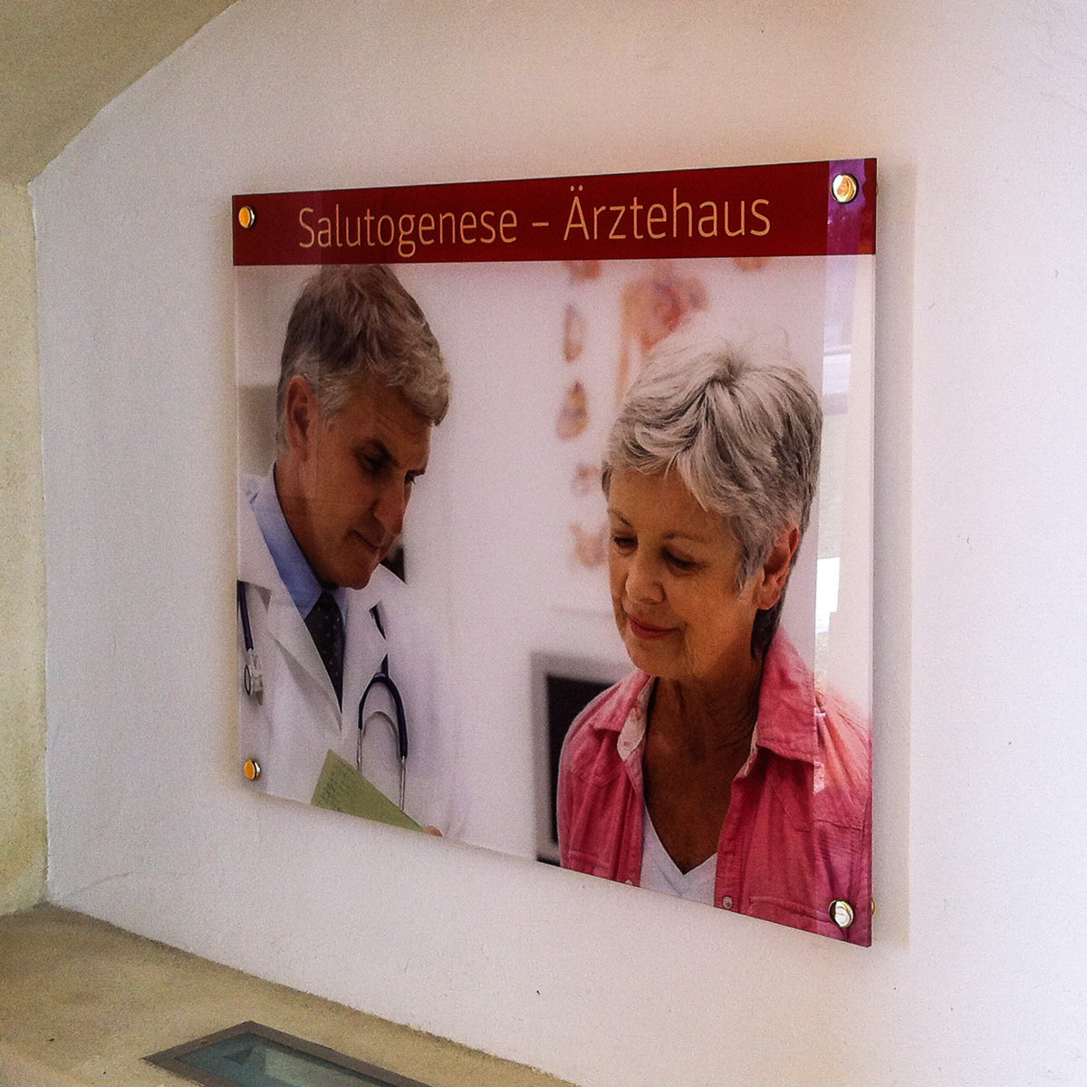 Direkt bedrucktes Acrylglas-Werbeschild, optional mit Weissdruck.
