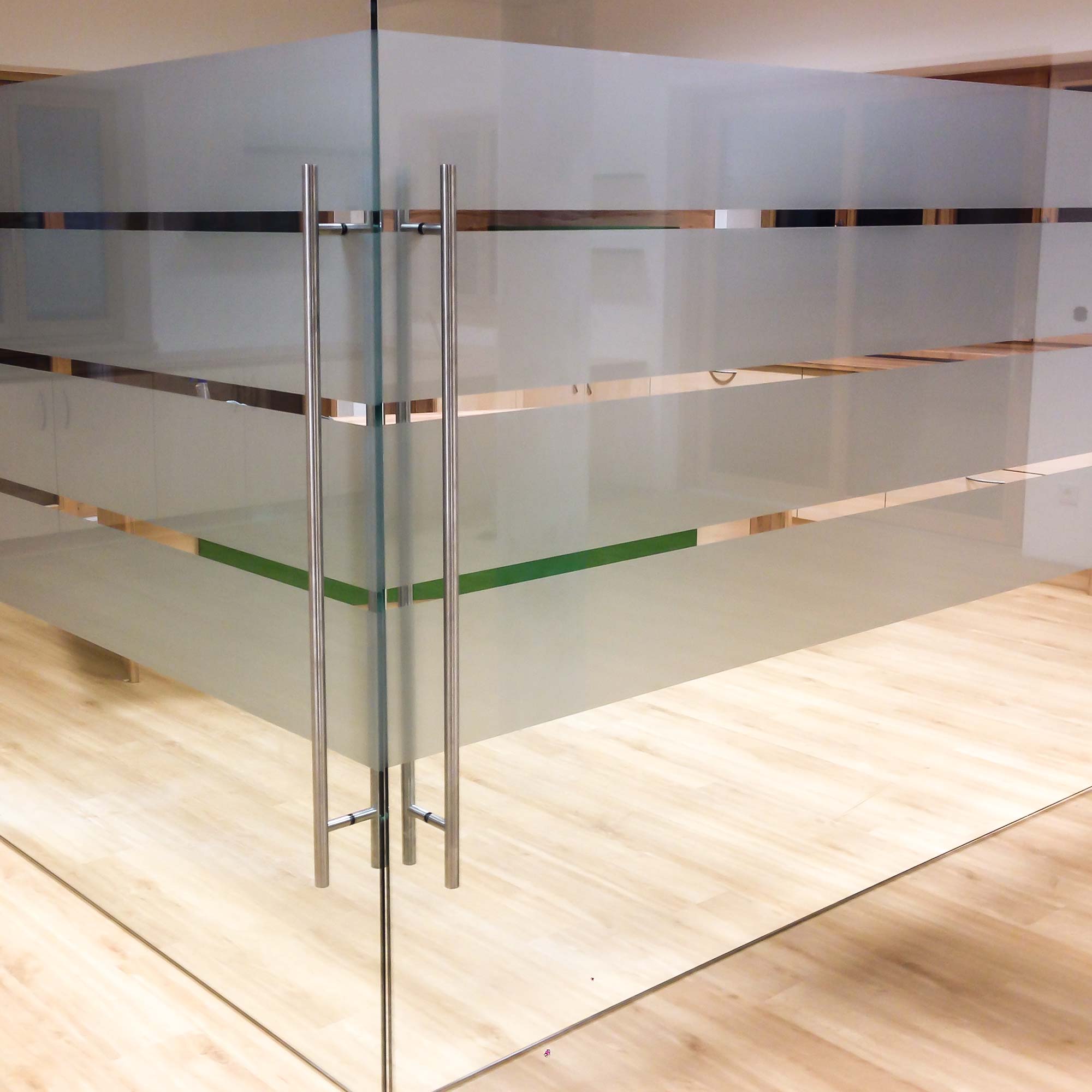 Konturgeschnittene Sandstrahlfolie mit seidenmatter, transparenter Oberfläche für die Verklebung auf Glas – vermittelt den Eindruck einer sandgestrahlten Oberfläche. Wird auch als Glasdekorfolie oder Satinatorfolie bezeichnet.