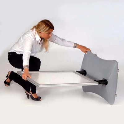 40 mm Aluprofile mit Ecken auf Gehrung. Die Ecken bestehen aus abgerundeten Kunststoffecken, was das Verletzungsrisiko minimiert. Mit entspiegelten APET Frontplatten, montiert mit einer schwarzen Gummikante, zum Schutz vor eindringendes Wasser. Die Federn sind gegen Rost behandelt. Der Fuß ist aus Kunststoff hergestellt und kann mit Wasser oder Sand befüllt werden. Bei Minusgeraden mit Frostschutzmittel mischen. 2 integrierte Rollen erleichtern den Transport des Kundenstoppers. Die Montage ist schnell und einfach.